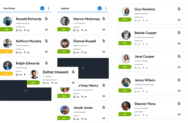 Gain a comprehensive understanding of your recruitment advancements all in one consolidated kanban board view.